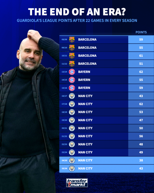 Nếu nhìn vào thành tích của các đội bóng do Guardiola dẫn dắt ở cùng thời điểm trong mùa giải, có thể thấy sự sa sút rõ ràng. Sau 22 vòng đấu, Man City hiện chỉ có 43 điểm. Trong toàn bộ sự nghiệp huấn luyện của Pep, chỉ có một mùa ông làm tệ hơn ở giai đoạn này – chính là mùa trước (38 điểm).